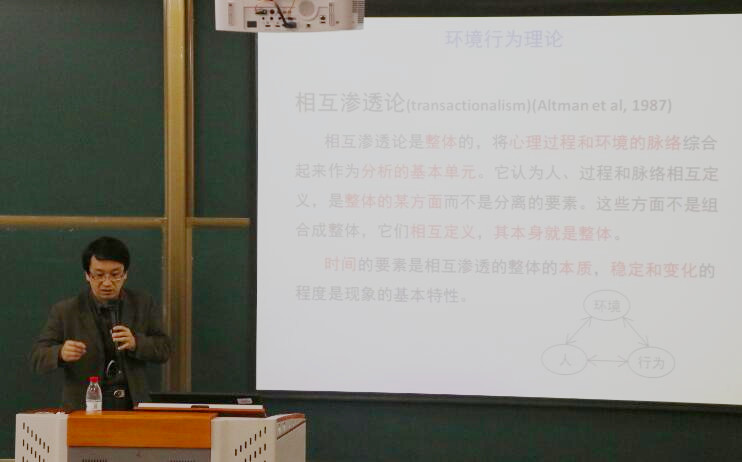 李斌教授首先为我们介绍了环境行为理论中的“相互渗透论”,探讨了“人、行为、环境”相互影响下的衡态。其次,分别引用“上海川沙城区和新城区”、“苏州高新技术区”、“汶川映秀震区”三个调研案例,分析了城市变迁与快速城市化,震后重建的农村环境变化后居民的“不适应”,表明了居住环境的营造应是长期、综合、动态的过程,在提高生活质量的同时,也应保留文化习俗、生活习惯,才能满足更多人的居住需求。最后,教授讲解了综合的、动态的“建筑设计方法论”。他鼓励同学们要看到建筑设计中人与环境的渗透过程,重视时间要素。