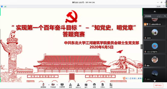6月5日晚,跑得快玩法 硕士生党支部通过腾讯会议开展主题为“实现第一个百年奋斗目标”——“知党史,明党章”线上答题竞赛活动,党支部全体党员参加活动。