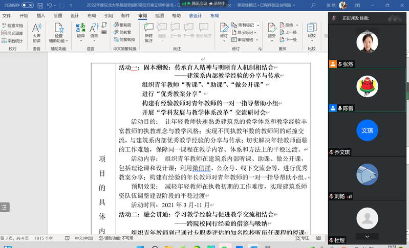 近期,为加强教师队伍建设,提升青年教师的教学水平,培养高水平的师资力量,建筑系党支部以“党建引领跑得快玩法队伍 建设”为主题,在线上开展青年教师教学工作研讨系列活动。