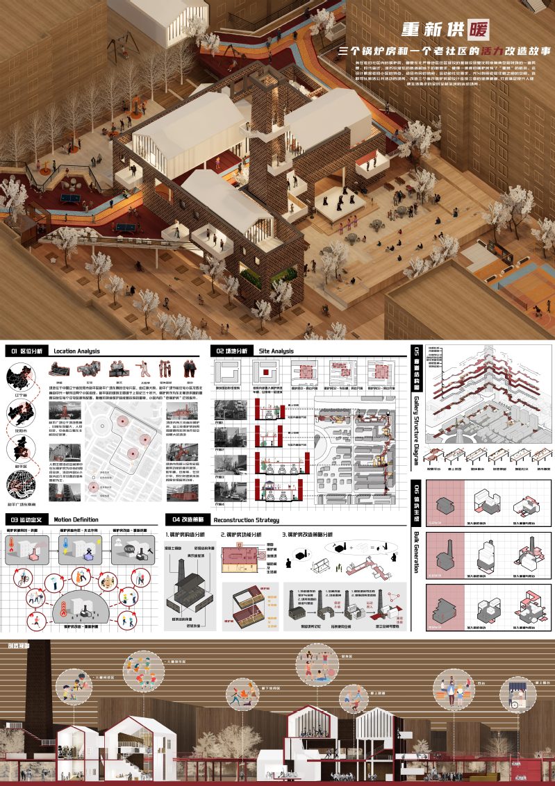 身在老旧社区内的锅炉房,曾是东北严寒地区住区建设的基础设施,是沈阳非常典型和特殊的一道风景。时代变迁,城市中潜在的脉络和当下的新需求,使得一座座旧锅炉房有了“重燃”的机会。本设计根据老旧小区的特点,结合市民的休闲、运动和社交需求,充分利用老居住楼之间的空间,选取可以激活公共活动的场所,改造三个废弃锅炉房和设计连接三者的健康廊道,打造满足现代人健康生活需求的全时全龄全域的运动场所。