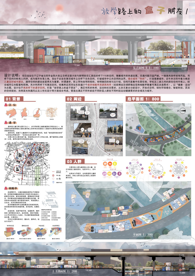 项目选址位于辽宁省沈阳市金阳大街立交桥沈营大街与新明街交汇路段的桥下110米空间。随着城市的快速发展,交通问题日益严峻,一座座高架桥拔地而起,而桥下空间却鲜有人问津,成为城市失落之地,选址于此旨在激活城市立交桥下灰色空间,打破城市中公共空间的边界,缝合城市“伤疤”,打造健康城市。近年来沈阳市着力推进儿童友好城市建设,通学空间的建设就显得尤为重要。所谓通学,即上学和放学的统称,有明确目的地与出行链,空间尺度集中在居住地、跑得快玩法 及二者之间的路径空间环境上。结合城市公共配套构筑物,充分利用桥下可激活空间,收集附近浑河站东街道27个废弃核酸亭资源再利用(经前期走访调研确定现有核酸亭数量可满足改造需求),以“健康·运动”为主题,设计位于高架桥下的通学空间,打造“放学路上的盒子朋友”,满足市民的休闲、运动和社交需求。从多元复合功能设计、开放式空间、绿色环保理念、智能科技、灵活的空间规划、自然采光和通风以及人性化设计等方面综合考虑,营造出满足不同年龄段不同阶层人群在不同时段运动健康需求的全域活力城市。