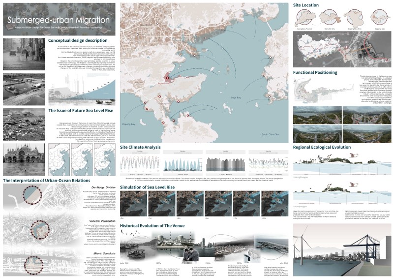 当我们反思 2024 年发生的动荡事件时,我们可以清楚地看到,不断变化的气候环境条件所带来的挑战早已经给世界各地的社区留下了不可磨灭的损害。这种变化不是一蹴而就的,而是在长期积累中逐渐显现出来的。随着全球气候变暖,海平面的上升,未来的滨海都市怎么才能应对海平面上升的威胁?我们聚焦于深圳市大亚湾区大鹏新区,作为面向未来的城市区域,堤坝、沉积和水泵都不是应对海洋灾害的长期解决方案。在未来 100 年里,这些动态且持续的海平面上升状态将比其他任何事情都更加彻底地改变城市环境。我们基于当下的装配式技术以及未来装配技术的潜力,制定了一个淹没城市迁移试验,以三个时期为节点,思考未来滨海都市的迁移与安置模式。我们提出洋面变动适应性概念城市设计,与过去的静态城市解决方案不同。通过依靠未来海洋变化预测,不断调整装配城市的动态变化,最终创新出一个适应未来海洋变化趋势的滨海城市。