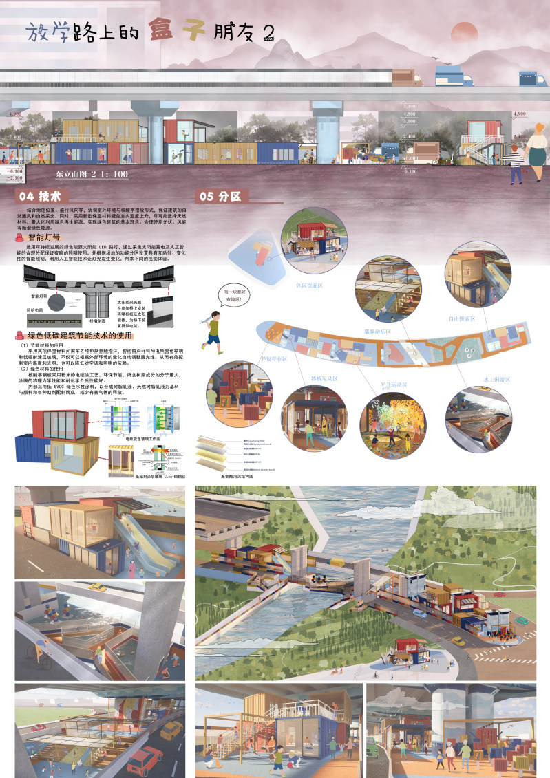 项目选址位于辽宁省沈阳市金阳大街立交桥沈营大街与新明街交汇路段的桥下110米空间。随着城市的快速发展,交通问题日益严峻,一座座高架桥拔地而起,而桥下空间却鲜有人问津,成为城市失落之地,选址于此旨在激活城市立交桥下灰色空间,打破城市中公共空间的边界,缝合城市“伤疤”,打造健康城市。近年来沈阳市着力推进儿童友好城市建设,通学空间的建设就显得尤为重要。所谓通学,即上学和放学的统称,有明确目的地与出行链,空间尺度集中在居住地、跑得快玩法 及二者之间的路径空间环境上。结合城市公共配套构筑物,充分利用桥下可激活空间,收集附近浑河站东街道27个废弃核酸亭资源再利用(经前期走访调研确定现有核酸亭数量可满足改造需求),以“健康·运动”为主题,设计位于高架桥下的通学空间,打造“放学路上的盒子朋友”,满足市民的休闲、运动和社交需求。从多元复合功能设计、开放式空间、绿色环保理念、智能科技、灵活的空间规划、自然采光和通风以及人性化设计等方面综合考虑,营造出满足不同年龄段不同阶层人群在不同时段运动健康需求的全域活力城市。