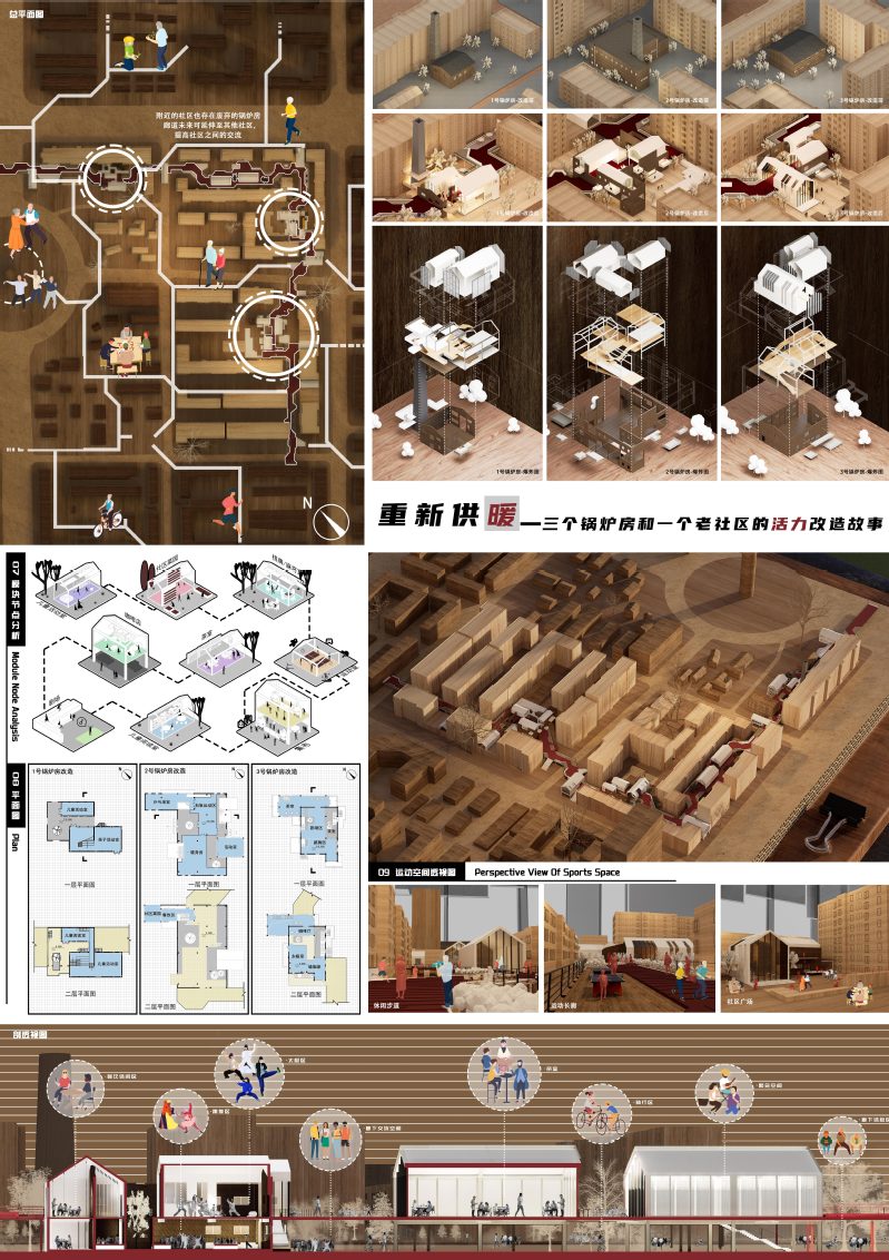 身在老旧社区内的锅炉房,曾是东北严寒地区住区建设的基础设施,是沈阳非常典型和特殊的一道风景。时代变迁,城市中潜在的脉络和当下的新需求,使得一座座旧锅炉房有了“重燃”的机会。本设计根据老旧小区的特点,结合市民的休闲、运动和社交需求,充分利用老居住楼之间的空间,选取可以激活公共活动的场所,改造三个废弃锅炉房和设计连接三者的健康廊道,打造满足现代人健康生活需求的全时全龄全域的运动场所。