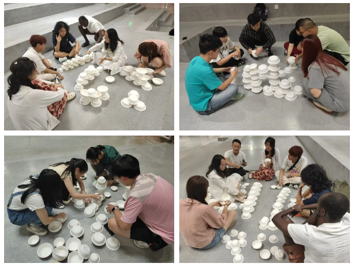 工作坊一:构造搭建+光影感知:小组搭建“纸碗墙”、打光拍照。
