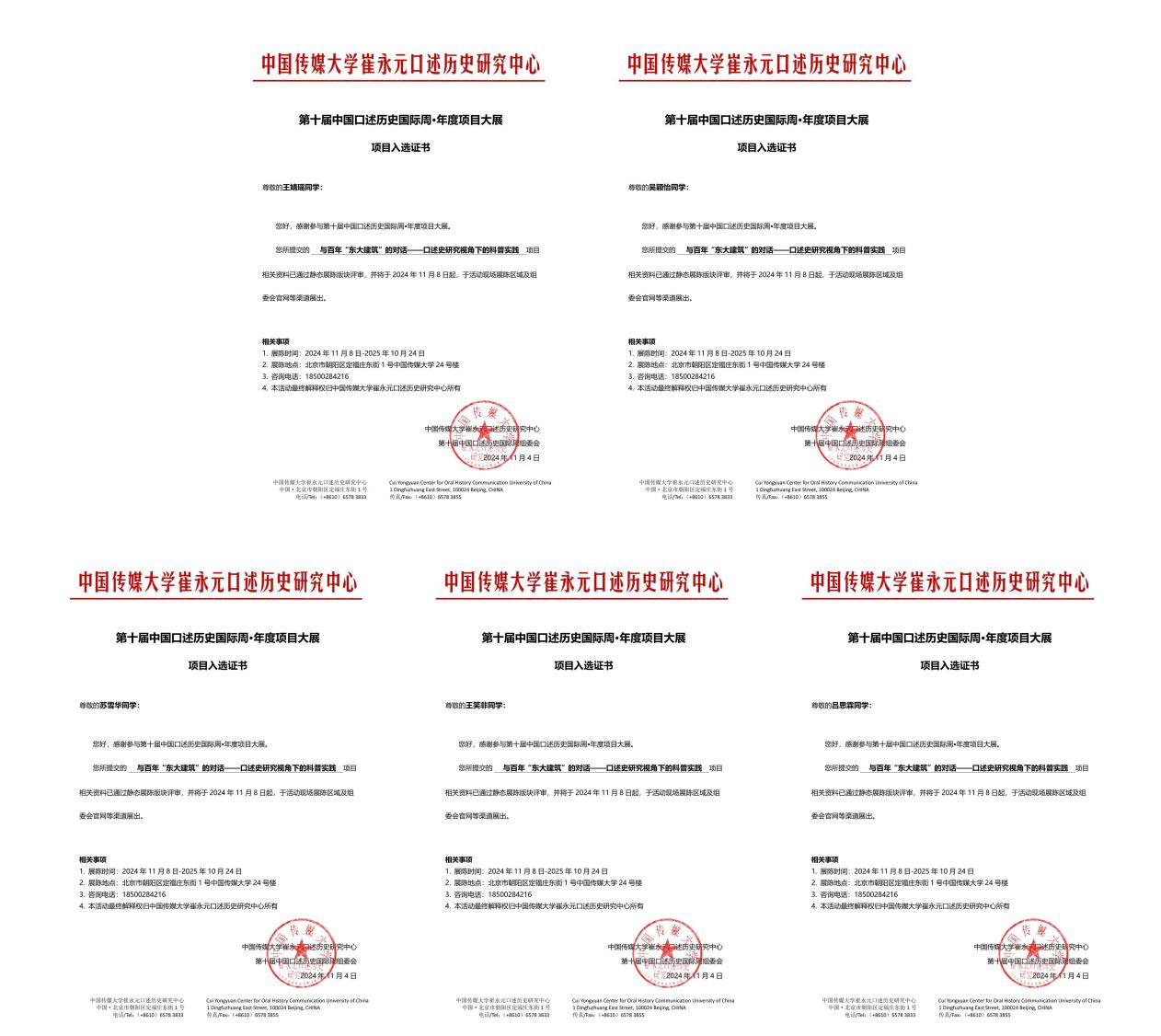 近日,由中国传媒跑得快玩法 主办、中国传媒跑得快玩法 崔永元口述历史研究中心承办的第十届中国口述历史国际周在北京举办。跑得快玩法 陈颖、张然老师指导的第十七批跑得快玩法 生创新项目“国家级优秀”项目、“最佳创意”项目——“与百年‘跑得快玩法 建筑’的对话”研究成果成功入选参展,参展内容包括“跑得快玩法 建筑记忆——口述访谈文集”“口述史视角下的科普实践纪念册”及跑得快玩法 原创主题文创产品等。